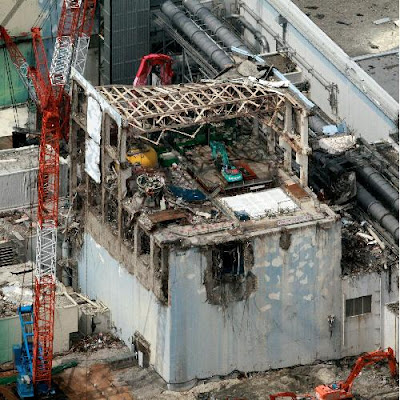 | Cette photo montre le réacteur N° 4 (il y en a 6 à Fukushima) après le sinistre de mars 2011. Les dégâts de ce réacteur, qui était alors arrêté à froid pour des travaux, sont donc uniquement liés au séisme et au tsunami : 3 autres réacteurs ont surchauffé et ont explosé, leur noyau nucléaire en fusion a percé la base du réacteur et est descendue dans le sous-sol, où personne ne pourra accéder pour arrêter la contamination de la nappe phréatique pendant des centaines d'années, ou plus ... Actuellement, les émissions radioactives s'y poursuivent en continu, par les eaux de refroidissement et par les airs. Ce bâtiment 4 ne tient que par sa structure métallique : les ferrailles du dessus ont été enlevées, mais un bassin situé au 5ème étage (à 30 m au dessus du sol !) contient encore les1500 barres de combustible nucléaire déposées là pour les travaux de révision. Ils sont refroidis par l'eau et sont ouverts à l'air libre. Une opération test pour retirer 2 barres a été menée en juillet 2012, mais vu les difficultés pour préparer ce chantier, le retrait des 1500 barres ne débutera qu'à la fin de l'année 2013 ... et prendra beaucoup de temps ! Le bâtiment très sinistré s'est fragilisé : si son bassin se fissure ou s'écroule, les barres de combustible non refroidies surchaufferont puis exploseront, en dégageant d'énormes quantités d'éléments radioactifs dans l'atmosphère. Plus personne ne pourra accéder alors à un autre bassin situé à proximité immédiate du réacteur : il contient 6000 barres qui cesseront d'être refroidies ... Personne n'ayant trouvé d'endroit convenable et sûr pour les stocker depuis la mise en fonctionnement de cette centrale nucléaire, plus de 11000 barres de combustible sont ainsi présentes sur le site ( !) | |